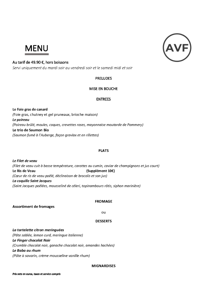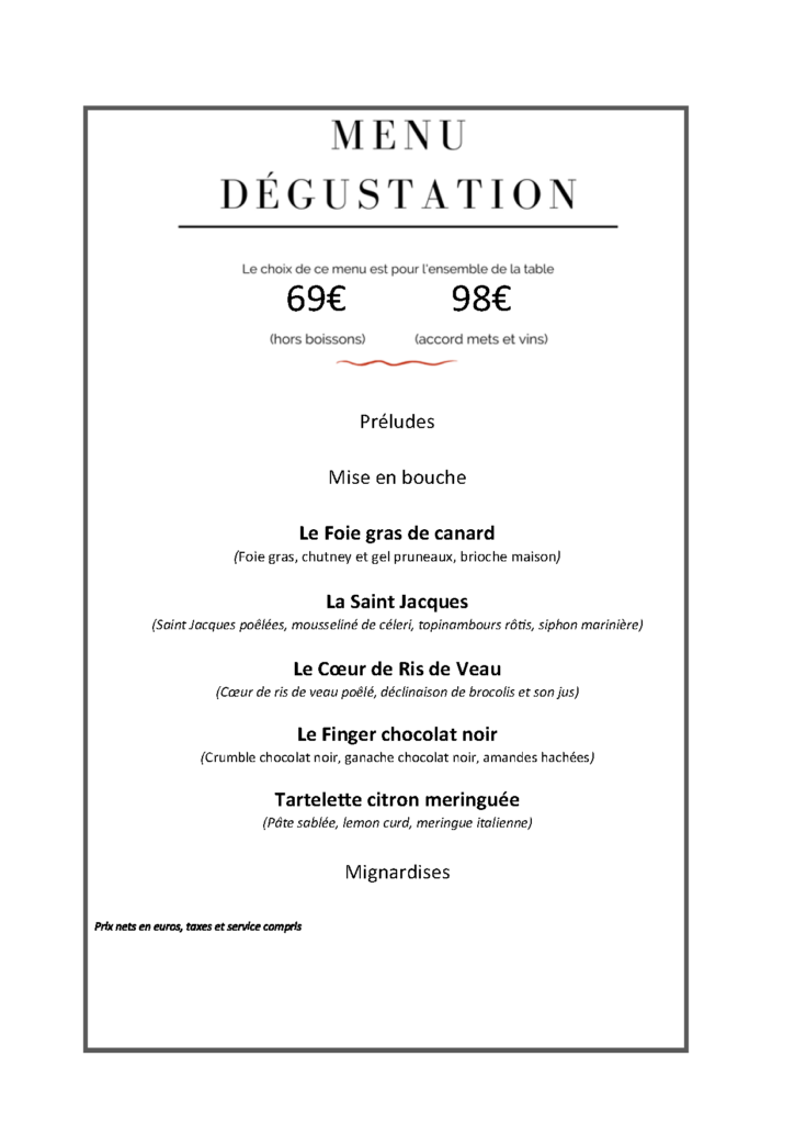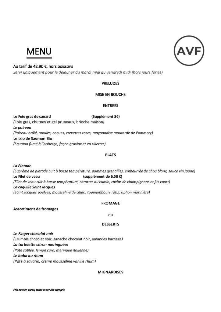 – Taille de groupe minimale : 8 personnes – Choix du menu similaire pour l’ensemble des convives (même entrée, même plat et même dessert) – Choix transmis au plus tard 10 jours avant votre venue Le menu est établi à votre convenance et en fonction de vos envies.